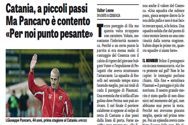 “Terzo pareggio di fila ma questa volta strappato con carattere. Voluto, nonostante l’inferiorità numerica. Perché a un certo punto la partita si era messa male: il vantaggio del Cosenza con il calcio di rigore del giovane bulgaro Vutov e l’espulsione di Pelagatti che aveva strattonato l’attaccante. La squadra di Roselli nel secondo tempo stava facendo meglio, poi sui titoli di coda il pareggio di Plasmati. Una sventola che si infila all’angolino dove Perina non può arrivare. E nel finale il portiere calabrese si oppone al colpo di testa di Caetano a due passi dalla linea di porta. Forse sarebbe stato troppo ma, alla fine, il punto è meritato. SOLLIEVO «Non era facile. Però – esordisce Pancaro in sala stampa – alla fine siamo stati premiati. Non era semplice su questo campo, per come si era messa la partita. Però abbiamo dimostrato di avere un grande carattere. Punto meritato e pesante». Decisiva la prodezza di Plasmati. «Lo vado dicendo da tempo che Gianvito lo vedo in crescita. Sta bene e ci darà una grande mano in questo girone di ritorno. Un gol da grande attaccante qual è: tanta rabbia e una potenza indescrivibile». L’allenatore del Catania sottolinea anche il valore del Cosenza. «Una squadra che subisce poco, gioca sempre dietro la linea della palla e non è mai facile trovare spazi, si fa fatica. Una squadra solida che dal punto di vista tecnico lavora su una continuità dalla scorsa stagione. Subito dopo le prime tre, quattro squadre ci siano loro». IL BOMBER Felice il protagonista in casa rossoazzurra. «Le loro proteste sul gol? Non le ho capite: le immagini parlano chiaro. Alla fine – sottolinea Plasmati – il pareggio è più che meritato. Il nostro grande merito è stato quello di non disunirci nel momento del gol, non abbiamo mai perso la testa. Perché noi avevamo giocato meglio, specie nel primo tempo. Poi un episodio aveva cambiato il corso della gara. Ma alla fine credo che torniamo a casa con un ottimo risultato, e un grande merito va alla squadra perché ha dimostrato di volere questo pareggio. Ci prendiamo il punto, su un campo molto difficile». Il Catania saluta anche il ritorno in campo di Bastrini dopo la lunga assenza. «Non vedevo l’ora di tornare, non ce la facevo più a lavorare solo in palestra. Finalmente torno a giocare a calcio, che è la cosa che più mi pace fare. Sono contento per aver strappato un punto Cosenza. La vittoria arriverà. Nel ritorno il Catania dimostrerà di essere grande»”. Questo quanto si legge sull’edizione odierna de “La Gazzetta dello Sport”.
