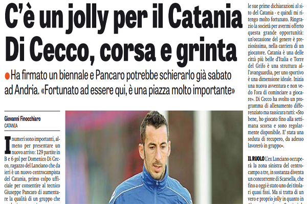 “I numeri sono importanti, almeno per presentare un nuovo arrivo: 129 partite in B e 6 gol per Domenico Di Cecco, ragazzo del Lanciano che da ieri è un nuovo centrocampista del Catania, primo colpo ufficiale per consentire al tecnico Giuseppe Pancaro di aumentare la qualità di un gruppo che vuole rimontare e incrementare una classifica molto corta. LA GIORNATA Di Cecco è arrivato in città poco dopo le 10.30. Avvistato in aeroporto, è stato prelevato da un dirigente e condotto nella sede di Torre del Grifo. Al Village c’erano i dirigenti rossazzurri ad attendere il ragazzo che è stato condotto anche in giro per la struttura, giusto per rendersi conto in che ambiente potrà lavorare. Nel pomeriggio, De Cecco si è allenato con i compagni per la prima volta, visto che nelle ore precedenti aveva subito firmato un accordo con il Catania: contratto biennale, passaggio in rossazzurro da Lanciano a titolo definitivo. «Tanti calciatori vorrebbero essere al mio posto le sue prime dichiarazioni al sito del Catania – e quindi mi ritengo molto fortunato. Ringrazio la società per avermi offerto questa grande opportunità: un’occasione del genere è preziosissima, nella carriera di un giocatore. Catania è una delle città più belle d’Italia e Torre del Grifo è una struttura all’avanguardia, per uno sportivo è una dimensione ideale. Inizia una nuova avventura e non vedo l’ora di cominciare a giocare». Di Cecco ha svolto un programma di allenamento differenziato ma rassicura tutti: «Sto bene, ho giocato fino alla settimana scorsa e sono regolarmente disponibile. E’ stata una seduta di recupero, da adesso lavorerò in gruppo». IL RUOLO L’ex Lanciano occuperà la zona sinistra del centrocampo a tre, in sostanza diventa un concorrente di Scarsella, che fino a oggi è stato uno dei titolari quasi fissi. Ma si tratta di un vero e proprio jolly in quanto in Abruzzo, specie con Gautieri allenatore, è stato impiegato anche in altri ruoli del centrocampo e pure da terzino. Incontrista con buone doti di corridore, riesce a creare superiorità numerica. Tanto è vero che nella prima parte della stagione, in B, ha disputato 17 partite segnando 2 reti. Visto che ha giocato sempre, ecco che Di Cecco potrebbe partire titolare già sabato ad Andria. Di Cecco ieri sulla sua strada ha incrociato Sebastian Leto, che è planato a Catania per discutere di alcuni particolari legati al contratto. Il Lanus che ha ripreso a lavorare non lo ha incluso tra i convocati e non è escluso che l’argentino si alleni con i rossazzurri in attesa di trovare una sistemazione”. Questo quanto si legge sull’edizione odierna de “La Gazzetta dello Sport”.