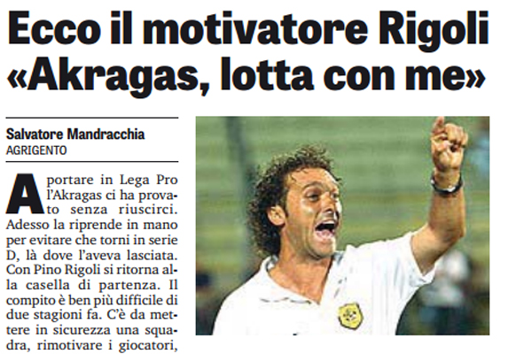 “A portare in Lega Pro l’Akragas ci ha provato senza riuscirci. Adesso la riprende in mano per evitare che torni in serie D, là dove l’aveva lasciata. Con Pino Rigoli si ritorna alla casella di partenza. Il compito è ben più difficile di due stagioni fa. C’è da mettere in sicurezza una squadra, rimotivare i giocatori, ridare speranze alla dirigenza, riportare la gente allo stadio e in poco tempo. A far pendere l’ago della scelta sull’allenatore messinese, l’umore della piazza. Bastava dare un’occhiata ai social per capire che lui avrebbe potuto compiere il miracolo di riportare la gente allo stadio, di ridare fiato e voce alla curva, di provare ad acciuffare per i capelli una squadra che non vince da 11 partite e che all’Esseneto non ha mai saputo dare la gioia di una vittoria ai suoi tifosi. AMARCORD ll ritorno di Pino Rigoli è questo ma tanto altro. Apre uno squarcio sui rapporti in seno alla società. Nonostante l’immagine data sia di grande compattezza, lui è un cuneo tra nuovi e vecchi dirigenti. Con Rigoli passa la linea del presidente Silvio Alessi. Il presidente onorario Marcello Giavarini l’accetta come colui che pensa «ok vediamo come va a finire» postando sui social un sinistro messaggio «presto la squadra sarà in mano agli agrigentini». Esulta Totò Catania, rientra nell’alveo delle sue competenze l’a.d. Tirri. Dopo 1 anno e 7 mesi Rigoli ha diretto un nuovo allenamento dell’Akragas. La squadra l’ha vista sugli spalti contro Catania e Messina ed in televisione. Si è confrontato telefonicamente con Legrottaglie che gli ha fornito utili indicazioni.«Lavorerò alla revisione degli equilibri emotivi e tattici. L’Akragas ha giocatori di categoria, faranno bene se lotteremo insieme e uno come Madonia c’è lo invidiano. Ho chiesto che resti». Rigoli porta il suo staff e quel 4-3″. Questo quanto si elgge sull’edizione odierna de “La Gazzetta dello Sport”.