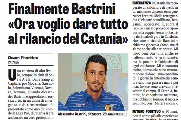 “Una carriera di alto livello, sempre in club di Serie A e B. Dalla Samp al Cagliari, poi Modena, Sassuolo, Salernitana, Vicenza, Novara, Ternana. Quando Alessandro Bastrini è approdato in rossazzurro, in un clima di emergenza e di ricostruzione, fu presentato come uno dei colpi della Lega Pro. Il Catania si era assicurato un vero professionista. Bastrini ha messo piede per la prima volta in campo sabato scorso a Cosenza, in un momento in cui il Catania lottava per recuperare il pareggio e cancellare l’inferiorità numerica: «E’ stata una bella emozione personale, ho pensato che finalmente mi sentivo un calciatore, che gli oltre sei, sette mesi di lavoro fisico per recuperare erano alle spalle. Devo ringraziare società, tecnico e compagni per fiducia e aiuto. Senza di loro, forse non ce l’avrei fatta. Mai ho pensato di mollare, ma certi giorni pensi se i sacrifici portino qualcosa. In Coppa, ad Agrigento, ero rientrato: subito mi feci male. Che jella. Ora voglio recuperare il tempo perduto». EMERGENZA Il Catania ha recuperato un calciatore di livello in un momento di piena emergenza per i centrali della retroguardia (Pelagatti squalificato, Bergamelli acciaccato). E, allora, il tecnico Pancaro potrebbe riproporre la coppia Ferrario-Bastrini del finale di gara in Calabria: «Insieme – ricorda Bastrini – abbiamo giocato a Como, ma ci siamo anche allenati spesso. Mi trovo bene con tutti, anche se l’allenamento è gratificante, ma la partita è l’obiettivo di ogni calciatore. Mi è mancata molto, adesso che sono rientrato spero di dare il mio contributo. I giorni in infermeria sembravano non passare mai e poi mai. Invece sono arrivato a rivedere il campo. Il Catania, intanto, ha conquistato un punto, ma dobbiamo tornare al successo subito, con il Matera in casa». FUTURO POSITIVO A 29 anni, non si pensa più alle esperienze azzurre. Bastrini fu convocato dal c.t. Casiraghi per le gare con l’Under 21 che nel 2007 servivano per la qualificazione Europea. Adesso il presente è Catania: «Anche il futuro, ho voglia di dimostrare quel che valgo e voglia di dire grazie ai dirigenti che mai, neanche durante questi giorni di mercato, mi hanno fatto sentire lontano dal gruppo. Nessuno mi ha mollato, hanno avuto tutti una parola di incoraggiamento per me e io mi sono sempre mostrato forte e disposto a soffrire per rientrare». Ieri Bastrini è tornato ad allenarsi, primo giorno della nuova settimana di lavoro, entrando dalla porta principale. Che per lui è rimasta costantemente aperta”. Questo quanto si legge sull’edizione odierna de “La Gazzetta dello Sport”.