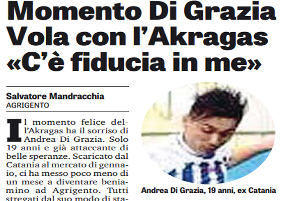 “Il momento felice dell’Akragas ha il sorriso di Andrea Di Grazia. Solo 19 anni e già attaccante di belle speranze. Scaricato dal Catania al mercato di gennaio, ci ha messo poco meno di un mese a diventare beniamino ad Agrigento. Tutti stregati dal suo modo di stare in campo. Dinamico, generoso, positivo, ad Agrigento lo volle Legrottaglie che se l’è goduto appena una partita. Lo sta valorizzando Pino Rigoli che in rosa si è trovato un diamante grezzo: 5 partite, 1 panchina, 3 gol. Un bottino che ha sorpreso lo stesso Di Grazia. «Quando sono arrivato non pensavo che avrei fatto così bene. Mi è stata data la giusta dose di fiducia che mi sento in dovere di ricambiare ogni volta che vesto la maglia dell’Akragas». GOL PESANTI Matera, Catanzaro ed Andria ovvero 3 reti fondamentali valse 9 punti ed equivalenti ad una grande spinta in classifica col 9° posto. Cosa impensabile 1 mese fa. «Quando sono arrivato – prosegue Di Grazia – il clima era ben diverso. Si affrontavano gli avversari preoccupati di non prenderle. Adesso abbiamo una strategia ed una mentalità ed un allenatore che è un grande motivatore. Sappiamo affrontare ogni fase del confronto. I risultati sono lì a testimoniarlo». Di Grazia ha sempre segnato. Il boom negli allievi del Catania con il suo pigmalione Ezio Raciti: 42 gol in 2 stagioni e la vittoria della Nike Cup. I 10 anni di Catania finiti con un prestito all’Akragas. «Volevo giocare e a Catania non avevo spazio. Si è fatta avanti l’Akragas. Ho detto, perché no?». SOSIA DYBALA Tutti d’accordo e scelta che si sta rivelando azzeccata. Lui non si pone alcuna obiettivo. Vuole giocare e segnare ispirandosi a Dybala, che ha eletto a modello. «Stravedo per lui, straordinario come sta in campo. E’ il mio punto di riferimento. Spero di segnare tanto come lui centrando il mio più grande obiettivo: salvare l’Akragas»”. Questo quanto si legge sull’edizione odierna de “La Gazzetta dello Sport”.