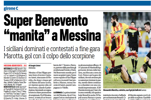 L’edizione odierna de “Il Corriere dello Sport” parla del tonfo del Messina che al San Filippo rimedia ben 5 sberle dal Benevento, ecco quanto si legge: “Messina e il San Filippo portano bene al tecnico Gaetano Auteri, siracusano di Floridia, che dopo i cinque gol col Matera del’anno scorso, si è ripetuto questa volta col Benevento, calando il pokerissimo e lanciando un segnale forte in chiave promozione al campionato. Per il Messina, invece, si tratta di un brusco risveglio dopo il successo col Martina e così i sogni di playoff vengono riposti nel cassetto, dove c’è spazio soltanto per una tranquilla salvezza. Partita mai in discussione con la formazione campana perfetta in tutti i reparti contro un avversario inesistente e confuso. Tre novità nel Messina rispetto alla gara di sabato scorso: Di Napoli ritrova in porta Berardi, alla fine tra i peggiori, e lancia dal 1’ Tavares e Barraco, partono dalla panchina gli ex infortunati Fornito e Parisi. Nel Benevento esordio per il nuovo acquisto Lopez, l’anno scorso espulso al San Filippo col Lecce, in avanti Cissé preferito a Mazzeo, mossa vincente di Auteri, assenti Campagnacci e Vitiello. La cronaca. La prima iniziativa è del Messina, che al 4′ impegna Gori su conclusione di Giorgione bravo nell’azione individuale. Al 6′ ospiti in vantaggio con un tiro di Ciciretti, che sull’assist di Cissé buca Berardi apparso poco reattivo; l’ex peloritano, al quinto centro stagionale, non esulta per rispetto alla sua ex squadra. Il Benevento appare subito di un’altra categoria e con una determinazione e un approccio alla sfida superiori, che non consentono al Messina alcuna reazione efficace. Al 19′ piazzato di Martinelli leggermente deviato dalla barriera, ma bloccato a terra da Gori. Finisce qui la gara dei siciliani, che non avranno più occasioni per rientrare in partita, mentre dietro continuano a sbandare con una continuità impressionante. Al 20′ Marotta inventa per Cissé, che in area controlla, si fa spazio e batte Berardi in uscita. Di Napoli avanza Barraco e punta sul tridente, ma è il Benevento a disporre in lungo e in largo dell’avversario e al 37′ Cissé fallisce il tris, alzando la mira da buona posizione. Si va al riposo, ma per i peloritani il disastro è dietro l’angolo. Di Napoli cambia il Messina con gli inserimenti di Fornito e Leonetti, ma la musica non cambia, anzi peggiora. Dopo tre minuti Del Pinto pesca di sinistro l’angolo con una traiettoria vincente e beffarda per un frastornato Berardi. Ciciretti Aveva lasciato il San Filippo a maggio scorso con la retrocessione del Messina nel derby perso con la Reggina e ieri invece ha giocato la partita perfetta, prendendosi una meritata rivincita. All’11 l’esterno ospite realizza il quarto gol, secondo personale, con un sinistro telecomandato che si spegne alla destra di Berardi. Per Ciciretti al 22′ c’è anche l’assist sul gol da cineteca di Marotta segnato con il colpo dello scorpione. Il pubblico del San Filippo contesta la squadra, c’è chi lascia lo stadio e nel finale Melara colpisce la parte alta della traversa. Al triplice fischio il Messina esce dal San Filippo a braccia alzate, chiedendo scusa ai tifosi, mentre dalla parte opposta si festeggia per la terza vittoria esterna stagionale dopo quelle di Catania e Andria”. Di seguito gli highlights del match: