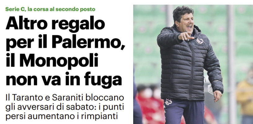 Era un crocevia decisivo, quello dello «Iacovone», col Palermo spettatore interessato. Il Monopoli, reduce da sei vittorie di fila, aveva la chance di prendersi il secondo posto in solitaria, respingendo i rosanero a quattro punti di distanza alla vigilia dello scontro diretto del «Veneziani». La sconfitta, invece, mantiene il divario invariato. Un solo punto separa la squadra di Baldini dai pugliesi, sconfitti all’andata grazie ad una rete di Brunori nei minuti finali. Si affiderà inevitabilmente al proprio bomber, il tecnico rosanero, alla ricerca della terza vittoria di fila per inserirsi lì, sul podio del girone C.