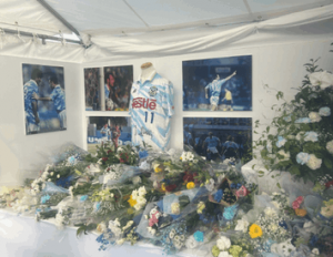 Per onorare la sua memoria, i tifosi del Jubilo Iwata hanno allestito un altarino in suo onore, dove spicca la sua maglia numero 11 indossata durante il suo periodo con il club. Sotto la maglia, una cascata di fiori bianchi e colorati, simbolo dell’affetto e della gratitudine dei fan giapponesi per il loro “eroe italiano”. Su cartelli e biglietti posti tra i fiori, si leggono messaggi di amore e ammirazione per Schillaci, ricordato non solo per i suoi gol, ma anche per il suo carattere umile e generoso.