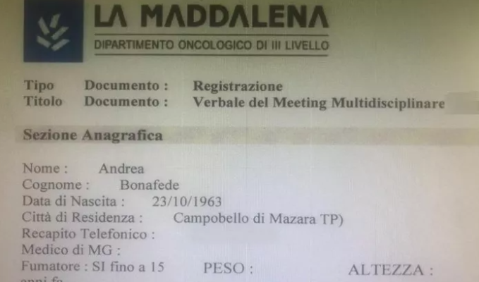 L’edizione online de “La Repubblica.it” riporta la cartella clinica di Matteo Messina Denaro. Operato due volte, la prima nel novembre del 2020, e ricoverato in day hospital almeno sei volte in due anni. Andrea Bonafede, alias Matteo Messina Denaro, era ormai di casa alla clinica La Maddalena di Palermo. Tanto che ogni volta che tornava per le chemioterapie, portava regali per tutti: “Era molto generoso, come i pazienti più facoltosi. Regalava olio ai medici”.