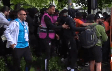 Attimi di tensione nei pressi del Gewiss Stadium a Bergamo nelle ore che precedevano la partita tra Atalanta e Marsiglia, semifinale di ritorno dell’Europa League.