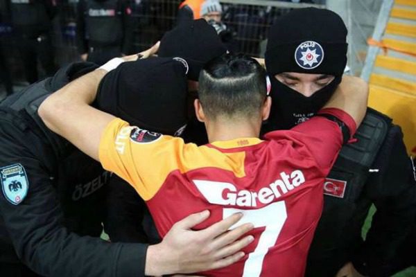 In un clima quasi surreale, questo pomeriggio il Galatasaray ha battuto per 3-1 il Gaziantespor a Istanbul all’indomani dei due diversi attentati successivi alla sfida fra Besiktas e Bursaspor nei pressi della Vodafone Arena, in cui hanno perso la vita 38 persone. La maggior parte delle vittime, sono forze dell’ordine: 30 poliziotti hanno perso la vita, insieme a otto civili. Per questo motivo, dopo aver realizzato il primo gol dei tre gol della serata, Oztekin ha esultato mimando prima il gesto del saluto militare, con la mano destra alla tempia. Successivamente, si è avvicinato a tre poliziotti presenti a bordo campo, li ha avvicinati a sé e li ha abbracciati, per esprimere il suo cordoglio. In alto la foto in questione.
