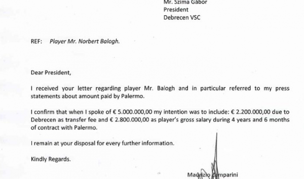 Il presidente del Palermo, Maurizio Zamparini, ha inviato una lettera di chiarimento al patron del Debrecen, per fare chiarezza sul “caso” Norbert Balogh (CLICCA QUI per leggere quanto scritto dalla “Gazzetta dello Sport” sul fatto). Ecco la lettera del patron rosanero, riportata dal sito ufficiale della squadra ungherese:
