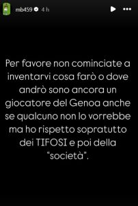 In questi giorni di calciomercato invernale si sta discutendo molto sul futuro di Mario Balotelli. Arrivato al Genoa pochi mesi fa, su richiesta di mister Alberto Gilardino prima del suo esonero, il giocatore ha collezionato pochi minuti in rossoblù, complice, probabilmente, anche il rapporto mai sbocciato col tecnico Patrick Vieira. L’ex attaccante del Milan ha fatto chiarezza sul proprio futuro attraverso le proprie Instagram Stories: “Per favore non cominciate a inventarvi cosa farò e dove andrò. Sono ancora un giocatore del Genoa, anche se qualcuno non lo vorrebbe. Ho rispetto soprattutto dei tifosi e poi della società”.