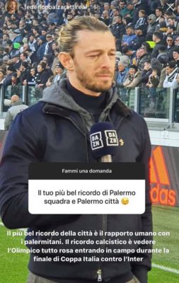 Attraverso le proprie storie Instagram, l’ex terzino del Palermo Federico Balzaretti, ha risposto alle domande dei propri follower parlando anche dei ricordi più belli legati al periodo in cui ha militato nel Palermo. “Il rapporto umano con i palermitani e l’Olimpico tutto rosa per la finale di Coppa Italia contro l’Inter”. Questi i ricordi che l’ex calciatore ha evidenziato. In alto la foto della risposta.