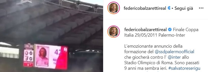 Balzaretti sui social ricorda le emozioni della finale di Coppa Italia 2011 persa contro l’Inter per 3-1: “Finale Coppa Italia 29/05/2011 Palermo-Inter. L’emozionante annuncio della formazione del @ssdpalermoofficial che giocherà contro l’ @inter allo Stadio Olimpico di Roma. Sono passati 9 anni ma sembra ieri.” Ecco il post: