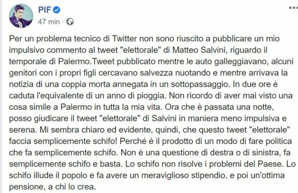 Pif si è voluto scagliare contro Matteo Salvini, leader della Lega Nord, dopo che quest'ultimo ha pubblicato un tweet "elettorale"...