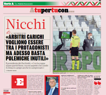 Gazzetta dello Sport: “Riparte la Serie A. Nicchi «Arbitri carichi vogliono essere tra i protagonisti ma adesso basta polemiche inutili»”