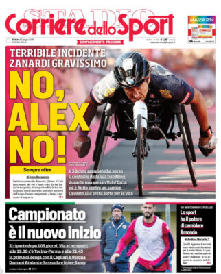 L'edizione odierna del "Corriere dello Sport" dedica la sua prima pagina all'incidente che ha coinvolto Alex Zanardi e alla ripartenza...
