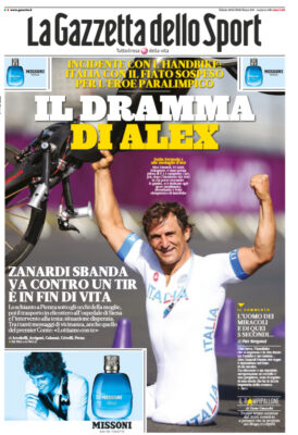 L'edizione odierna della "Gazzetta dello Sport" dedica la sua prima pagina ad Alex Zanardi, colpito da un grave incidente.