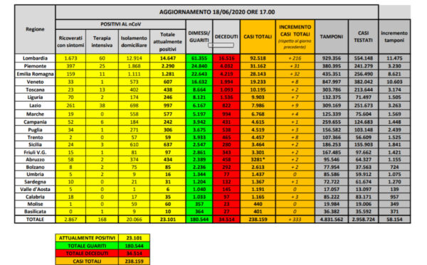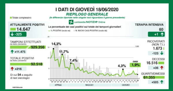 In Lombardia, la regione più duramente colpita dal Coronavirus, i nuovi casi di positività sono 216 mentre ieri 17 giugno...