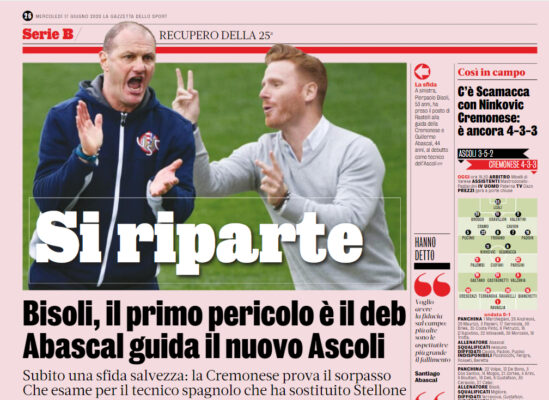 L'edizione odierna della "Gazzetta dello Sport" parla della ripresa della serie B. Oggi si gioca Ascoli-Cremonese, partita che fu sospesa...