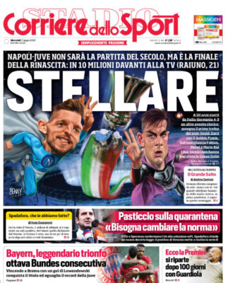 Corriere dello Sport: “Stasera la finale di Coppa Italia. Le probabili formazioni di Napoli-Juventus”