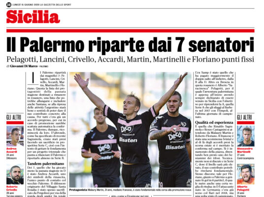 L'edizione odierna della "Gazzetta dello Sport" si sofferma sul futuro del Palermo. Si ripartirà dai 7 senatori Pelagotti, Lancini, Crivello,...