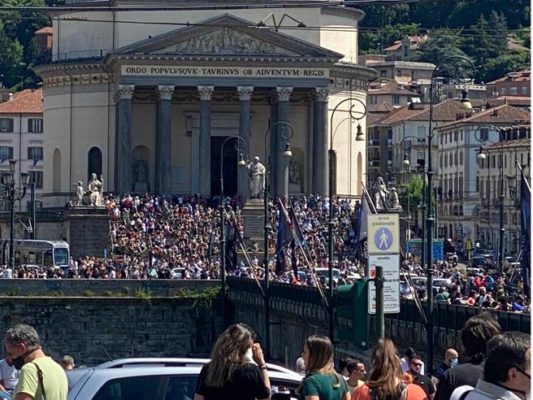 Torino si è fermata tra le 15 e le 15.20 per l’omaggio delle Frecce Tricolore, passate due volte sul centro...