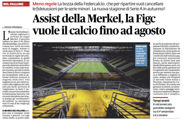 Il Fatto Quotidiano: “Assist della Merkel, la Figc vuole il calcio fino ad agosto. La nuova stagione di Serie A in autunno?”