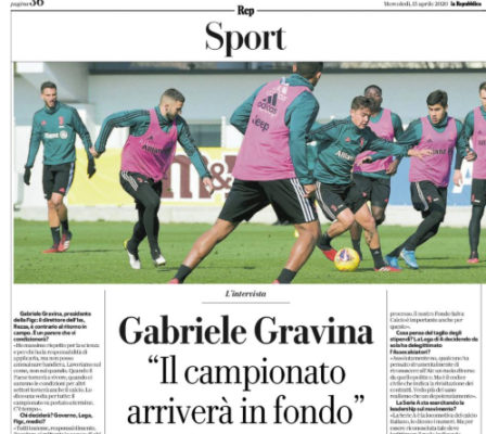 L'edizione odierna de "La Repubblica" riporta le dichiarazioni di Gabriele Gravina, presidente della FIGC: «Il campionato va portato a termine. Stop...