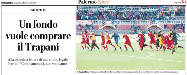 L'edizione odierna di "Repubblica" parla di un fondo interessato all'acquisto del Trapani. L'11 maggio, il Tribunale di Roma si pronuncerà...