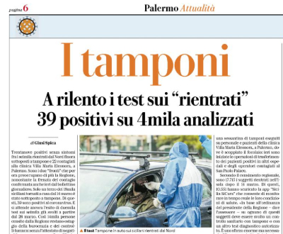 L'edizione odierna di "Repubblica" parla dei tamponi per il Coronavirus effettuati fra i seimila rientrati dal nord, che hanno evidenziato...