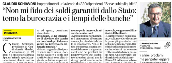 L'edizione odierna de "La Stampa" riporta le dichiarazioni di Claudio Schiavoni, presidente di Confindustria Marche: «Temo la burocrazia mentre adesso serve...