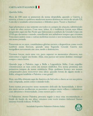 Dal Palmeiras una lunga ed emozionante lettera di vicinanza all'Italia con l'emergenza Coronavirus che incombe sempre di più. Ecco quanto...