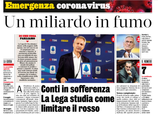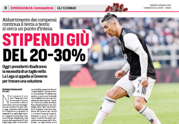 Corriere dello Sport: “Emergenza Coronavirus. Serie A, stipendi giù del 20%-30%. Oggi i presidenti ribadiranno la necessità di un taglio netto. La Lega si appella al Governo per trovare una soluzione”