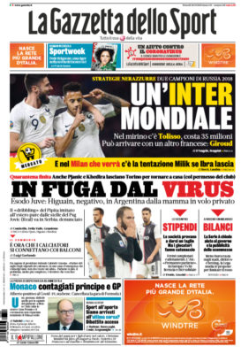 Prima pagina Gazzetta dello Sport: “In fuga dal virus”