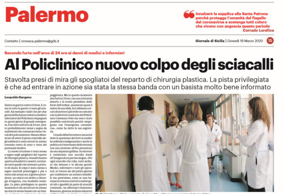 L'edizione odierna del "Giornale di Sicilia" si sofferma sull'ennesimo furto al Policlinico di Palermo. Due forti nell'arco di 24 ore....