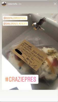 Il presidente del Palermo, Dario Mirri, come mostrato direttamente dal giocatore rosanero Roberto Floriano, ha inviato le famose "sfince" di...