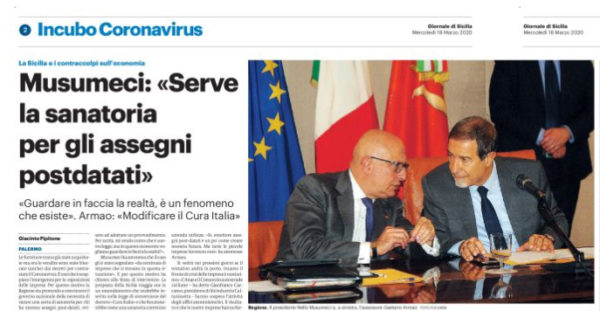 L'edizione odierna del "Giornale di Sicilia" riporta le dichiarazioni del presidente Musumeci sugli assegni postdatati: «C'è tanta ipocrisia - ha...