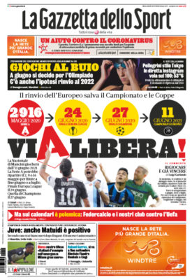 Prima pagina Gazzetta dello Sport: “ViA Libera! Il rinvio dell’Europeo salva il Campionato e le Coppe”