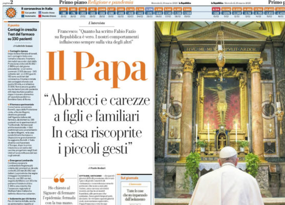 Repubblica: “Emergenza Coronavirus. Il Papa «Abbracci e carezze a figli e familiari. In casa riscoprite i piccoli gesti»”