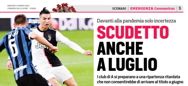 Corriere dello Sport: “Serie A, davanti alla pandemia solo incertezza. Scudetto anche a Luglio”