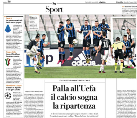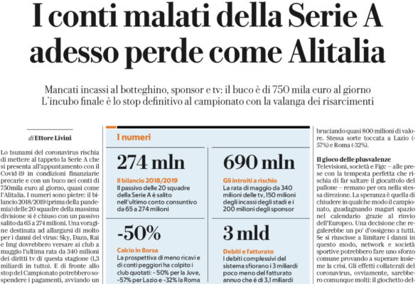 L'edizione odierna de "La Repubblica" si sofferma sulle sofferenze economiche della Serie A, provocate dall'emergenza Coronavirus. Buco nei conti di 750mila...