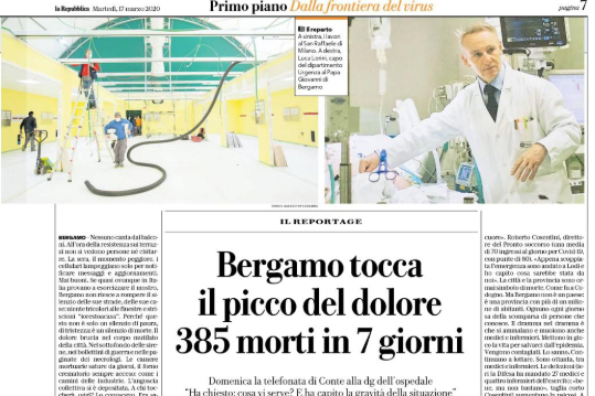 L'edizione odierna de "La Repubblica" si sofferma sulla situazione di Bergamo, una delle città più colpite dall'emergenza Coronavirus. Bergamo non riesce...
