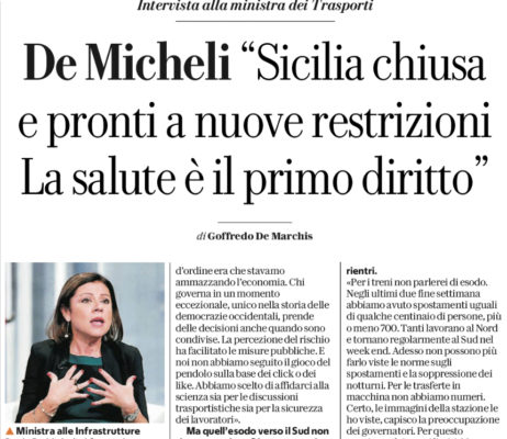 L'edizione odierna de "La Repubblica" riporta le dichiarazioni della Ministra De Micheli. Ministra De Micheli, oggi ha firmato il blocco quasi...