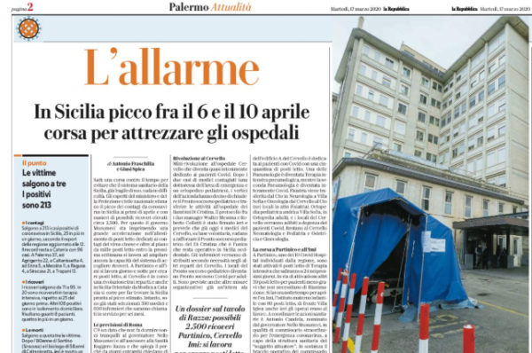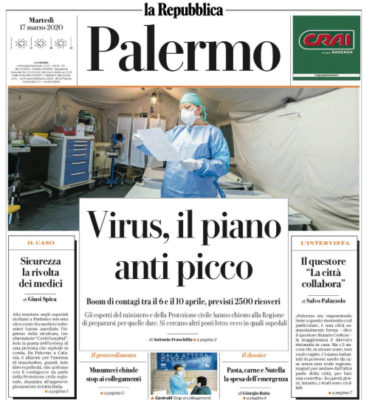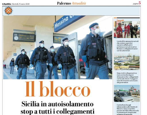 Nella sua prima pagina, l'edizione odierna de "La Repubblica" si sofferma sull'emergenza Coronavirus in Sicilia.