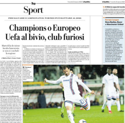 L'edizione odierna de "La Repubblica" analizza l'incertezza decisionale dell'Uefa di fronte alla pandemia Coronavirus. Salvare le coppe europee e Euro...
