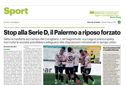 L'edizione odierna del "Giornale di Sicilia" si sofferma sullo stop della Serie D a causa dell'allarme Coronavirus. Un’intera giornata di campionato...