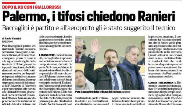 Corriere dello Sport: “Palermo, i tifosi chiedono Ranieri. Baccaglini è partito e all’aeroporto gli è stato suggerito il tecnico”
