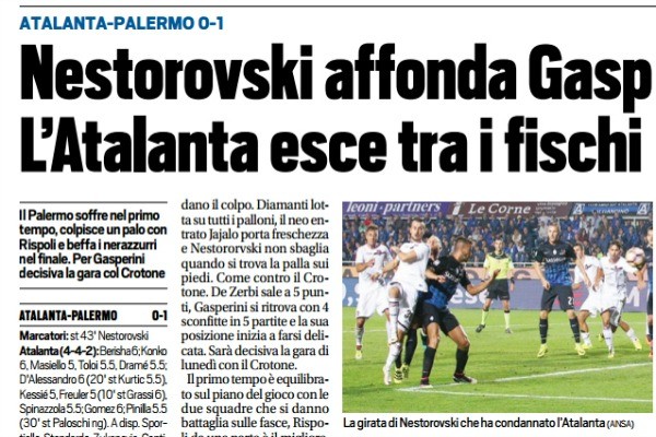 "Prima vittoria del campionato firmata Nestorovski. Cartolina dalla Macedonia per Giampiero Gasperini. fischiato dal pubblico di Bergamo dopo la seconda...