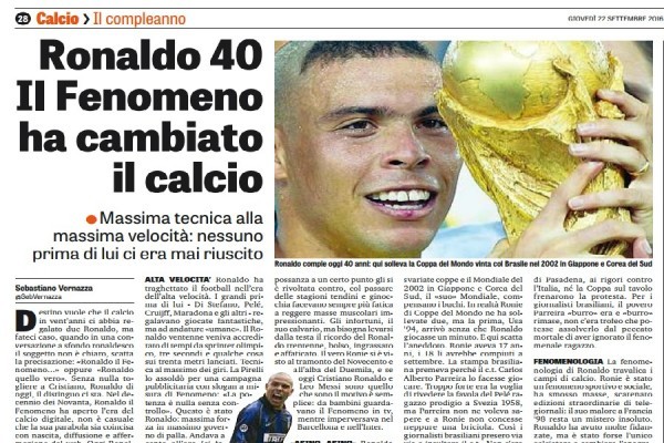Gazzetta dello Sport: “Ronaldo 40. Il Fenomeno ha cambiato il calcio. Massima tecnica alla massima velocità: nessuno prima di lui ci era mai riuscito”