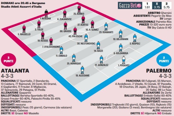 Ecco in alto le probabili formazioni di Atalanta-Palermo, partita valida per la 5^ giornata di serie A che si giocherà domani allo stadio...