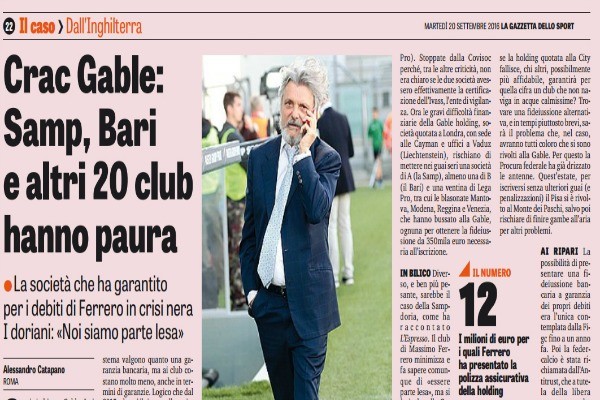 Gazzetta dello Sport: “Crac Gable, Samp, Bari e altri 20 club hanno paura. I doriani: «Noi siamo parte lesa»”