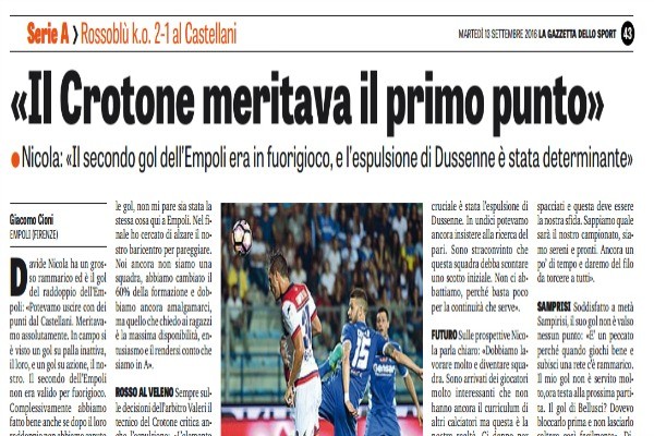 "Davide Nicola ha un grosso rammarico ed è il gol del raddoppio dell’Empoli: «Potevamo uscire con dei punti dal Castellani....